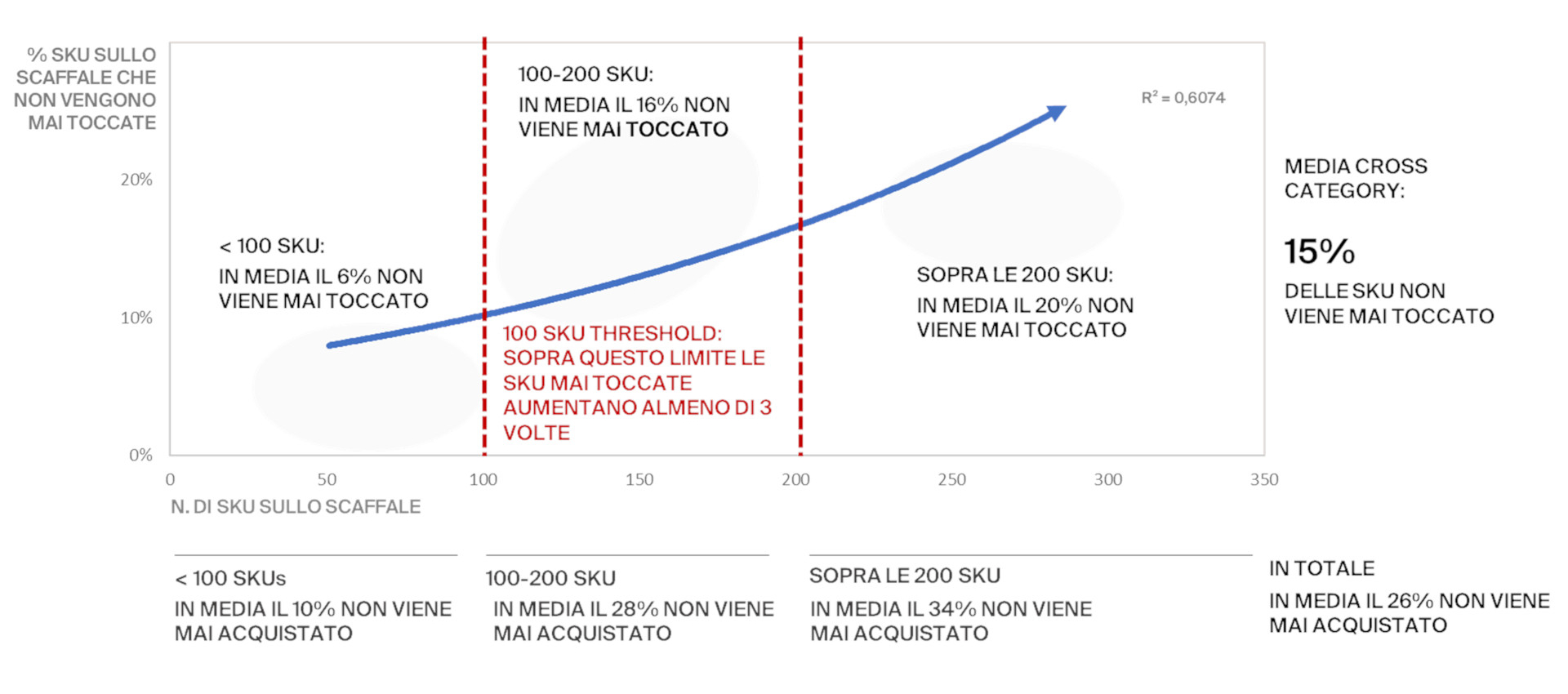 Curva di marginalità delle interazioni: SKU sullo scaffale vs % SKU che non vengono mai toccate dagli acquirenti – ©Grottinilab Global Shopper Database